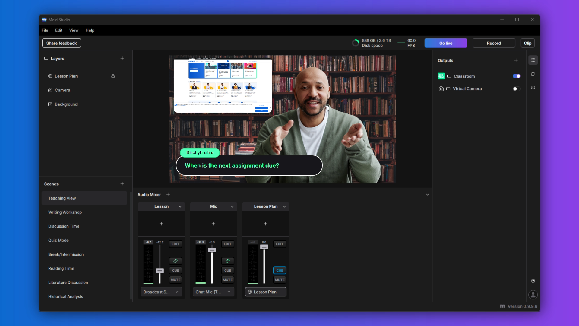 Educators can leverage Meld studio for virtual classes, office hours, live review sessions, and recorded lectures. With the scene-based system, it's easier to switch between different teaching modes such as intro slides to screen sharing for presentations.