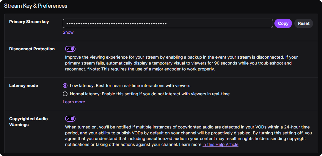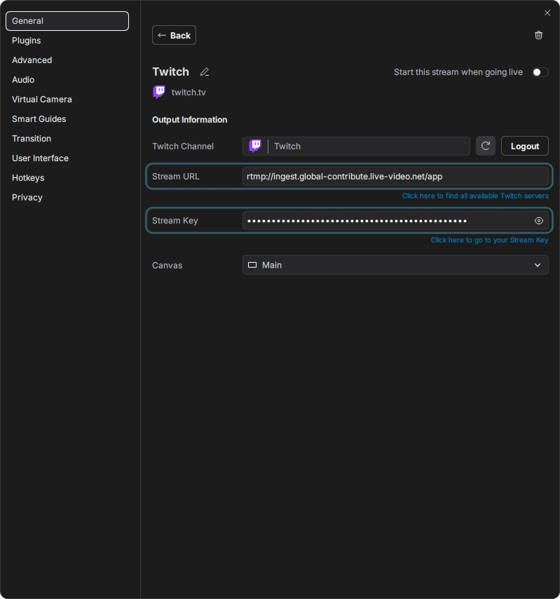 Your software will connect to Twitch either by logging in (this is highly recommended since Meld Studio has Twitch integration) or by using your Stream Key. To find your stream key head to your Twitch Dashboard and select Settings → Stream to find your Primary Stream Key.