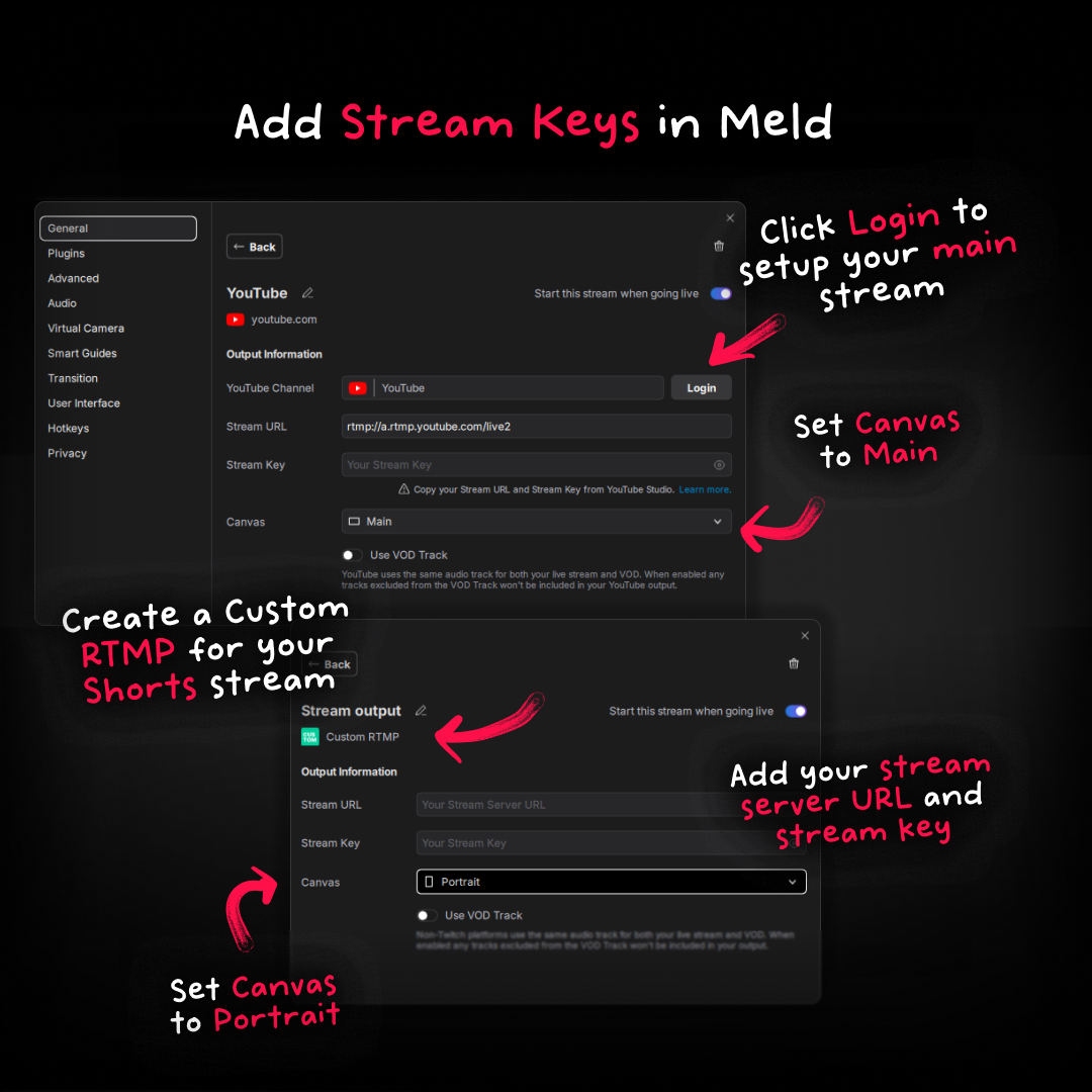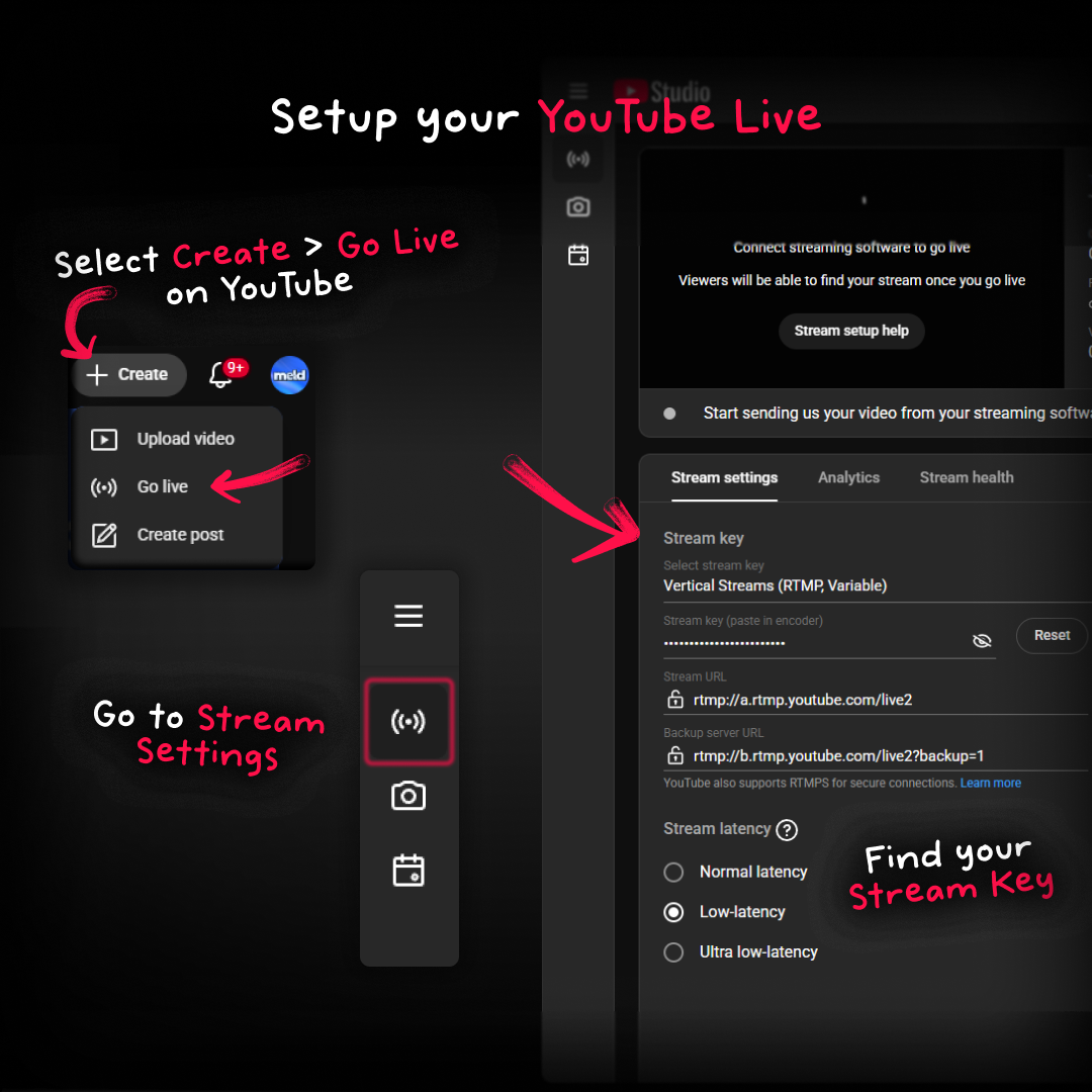 A Custom RTMP output lets you send the vertical feed to YouTube while keeping your integration nice and clean. Meld Studio fully supports Custom RTMP outputs with server URL + stream key.