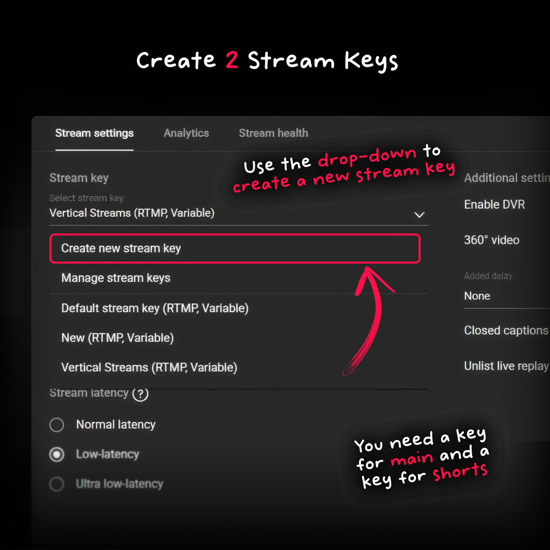 In Stream Settings you can use the dropdown to select your stream key. If you don't have two keys already, you can select Create new stream key and follow the steps.