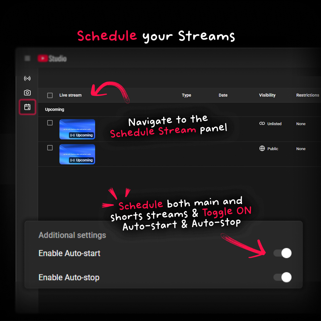 Although scheduling can make streams easier to manage and promote, you do not have to! YouTube also supports reusing settings, which can keep keys and options consistent between streams. This is also why you turn on Auto-Start/Stop.