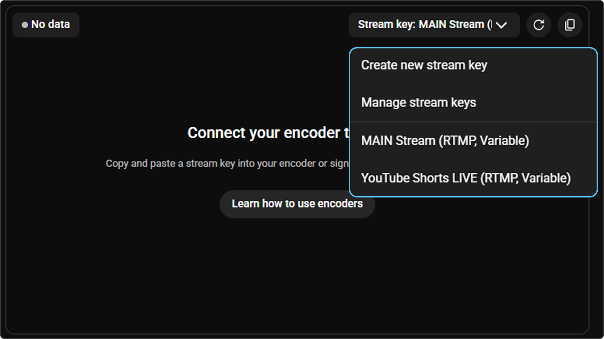 In the top right corner of the stream box you will see a dropdown menu for your Stream Key. You can create extra stream keys or do your initial setup by clicking the dropdown menu and selecting Create New Stream Key or Manage Stream Keys. If you have stream keys already created they will also appear in this menu. Choose the one you want to stream to.