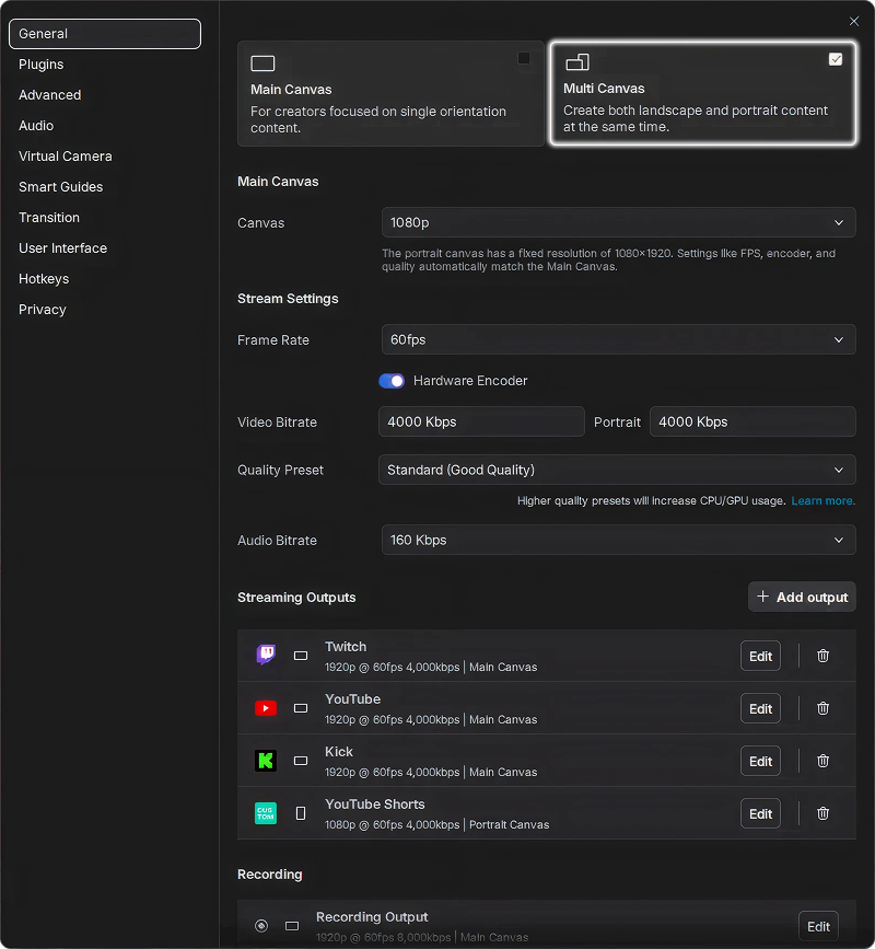 - Settings → General → Stream Outputs