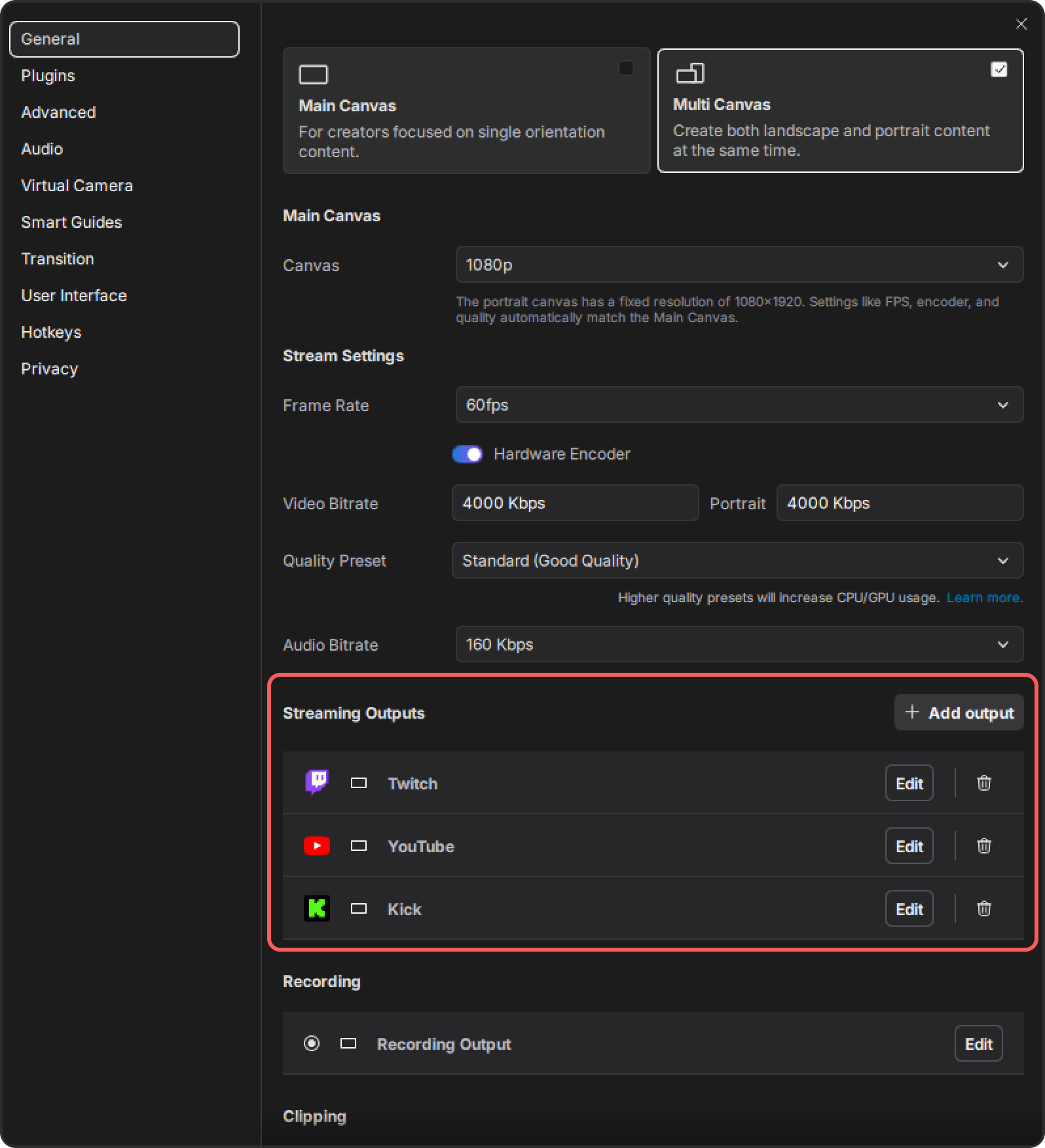 - Add Your Output Settings: Navigate to Settings within Meld Studio. You can do this by selecting the plus "+" on the right of Outputs or by going to File > Preferences > General and select + Add output.