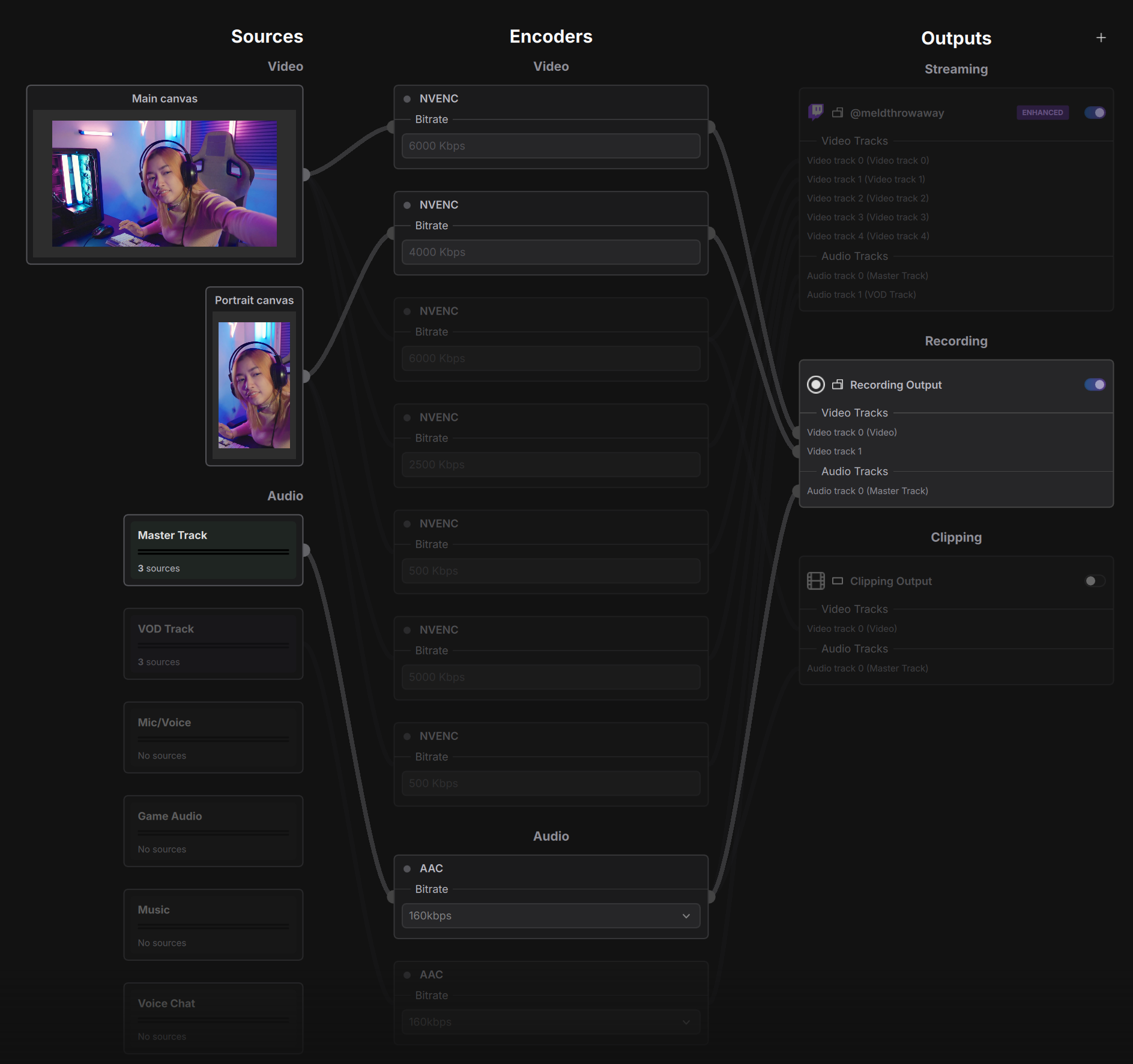 You can then change the "source" for the second video track to your portrait canvas (you'll need multi-canvas enabled) and if you then open up the encoder view (view > Open Encoder View) you should see that your recording output has two video tracks each pulling from different sources.