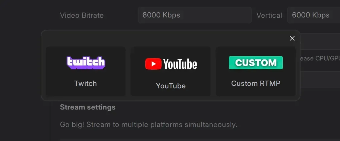 Stream to Twitch, YouTube, Kick, and Facebook simultaneously. Each output has independent settings. Grow everywhere without the hassle or monthly fees.