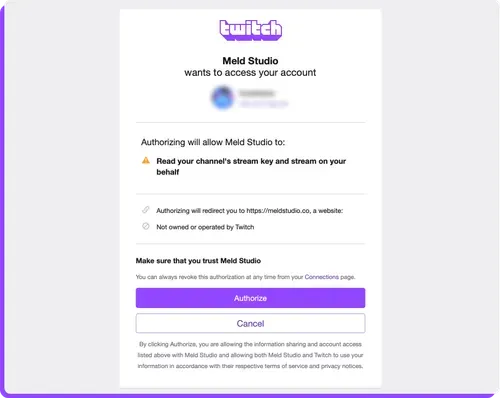 - You'll be redirected back to Meld, and your Twitch username will appear, confirming you're connected. Your stream server and stream key are now automatically configured!